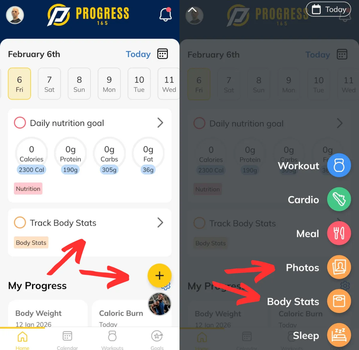 Every week there will be a prompt in the app 'Track Body Stats' where you can input your Body Weight and Measurements. All we need are you bust/chest, waist, hips, left thigh and left bicep. You can also add this manually using the + on the app.